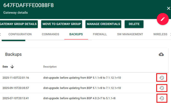 - To restore the gateway to an existing backup, click the circular symbol on the right hand side of the backup you wish to restore to listed in the table as seen below: