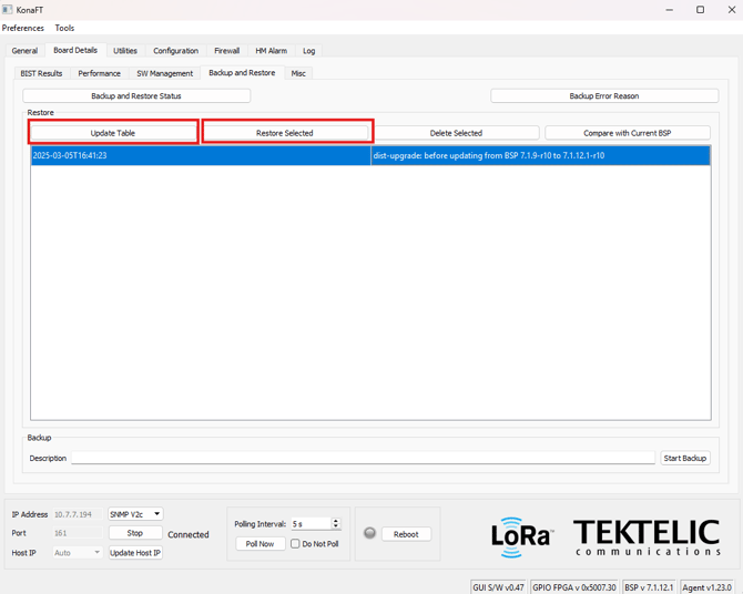 - To restore the gateway to an existing backup, select the backup you wish to restore the gateway to from the Table and click "Restore Selected"