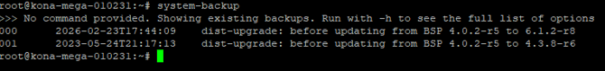 - Once the backup has been created, you can view it using the command system-backup as seen in the below screenshot: